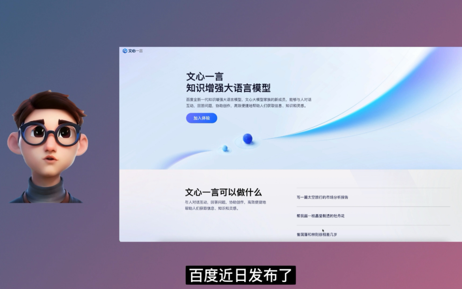 文心一言是百度打造出来的人工智能大语言模型,具备跨模态、跨语言的深度语义理解与生成能力,文心一言有五大能力,文学创作、商业文案创作、数理逻辑推算、中文理解、多模态生成,其在搜索问答、内容创作生成、智能办公等众多领域都有更广阔的想象空间。