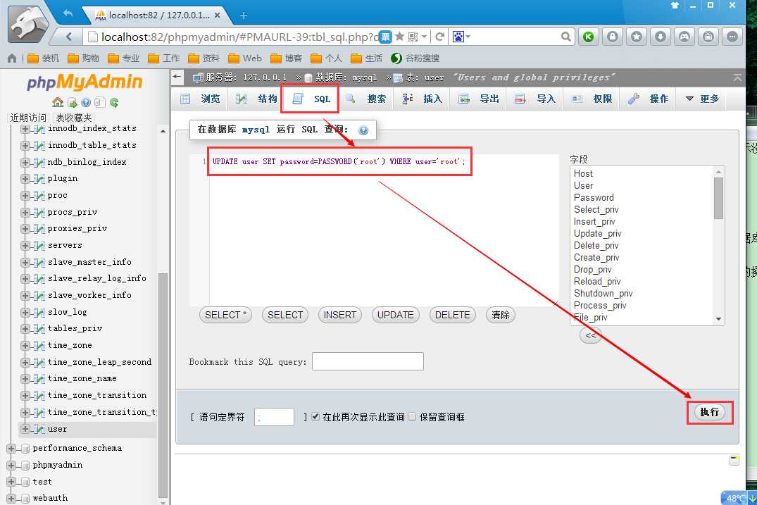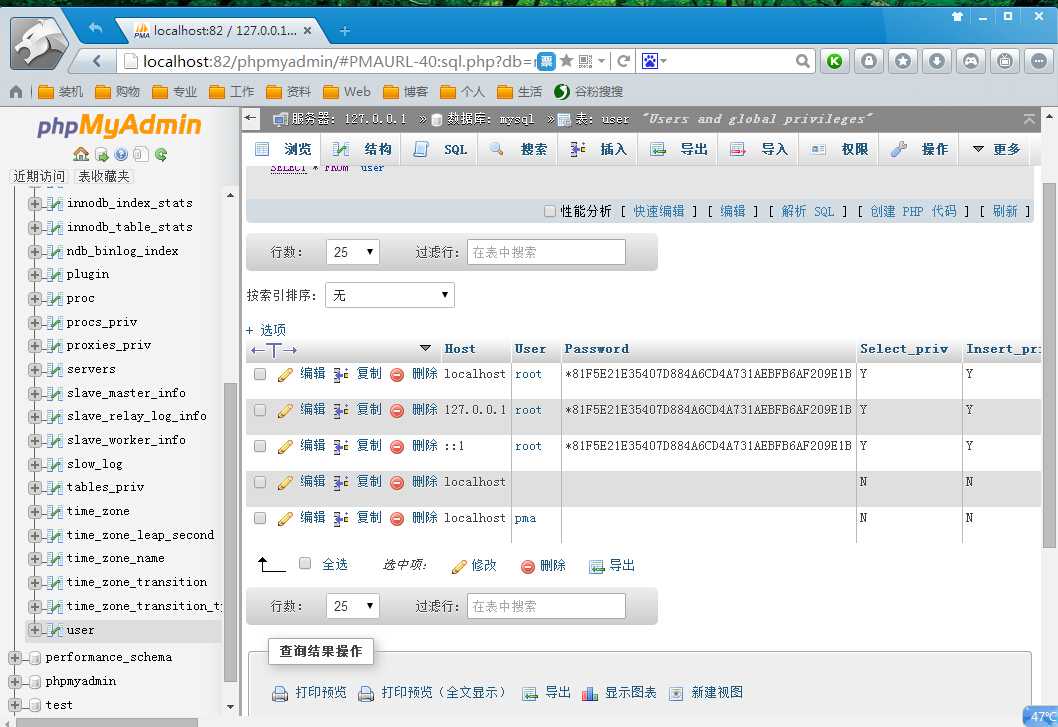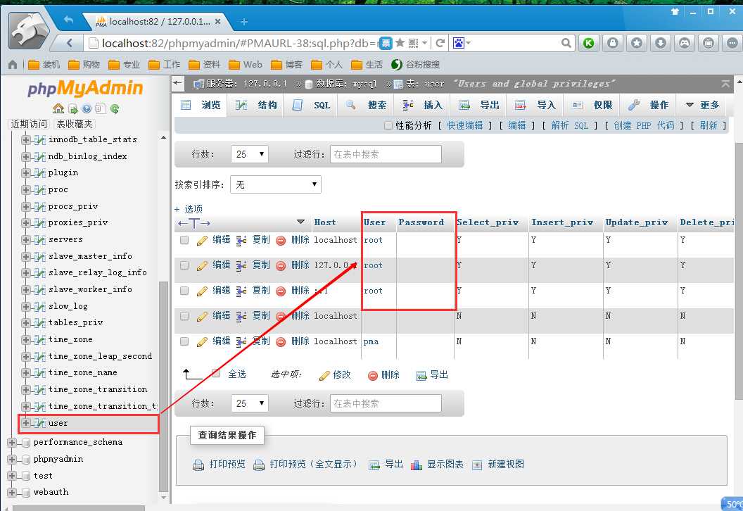 因为安装xampp后的mysql默认密码为空,在浏览器地址上输入http://localhost:82/phpmyadmin,能登录到phpmyadmin。进入到数据库的控制面板,然后选择名称为mysql的数据库,如图,可从中看出 user表中,root用户的密码为空。