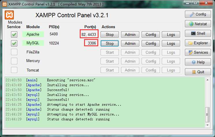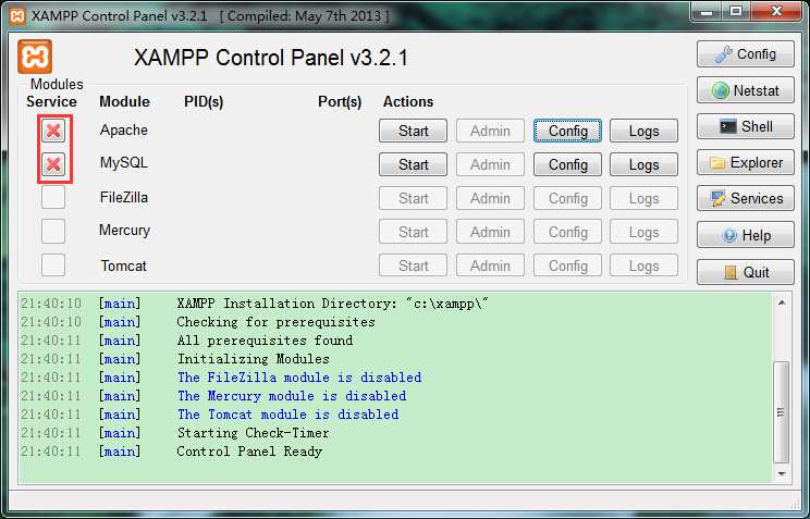 在XAMPP控制面板中,我们可以看到Service一列的单选框略有不同,“X”表示相应组件还没有设为Windows系统服务;“空白”表示没有安装该组件;此外还有“√”,表示该组件已经安装成为Windows系统服务,可以start。