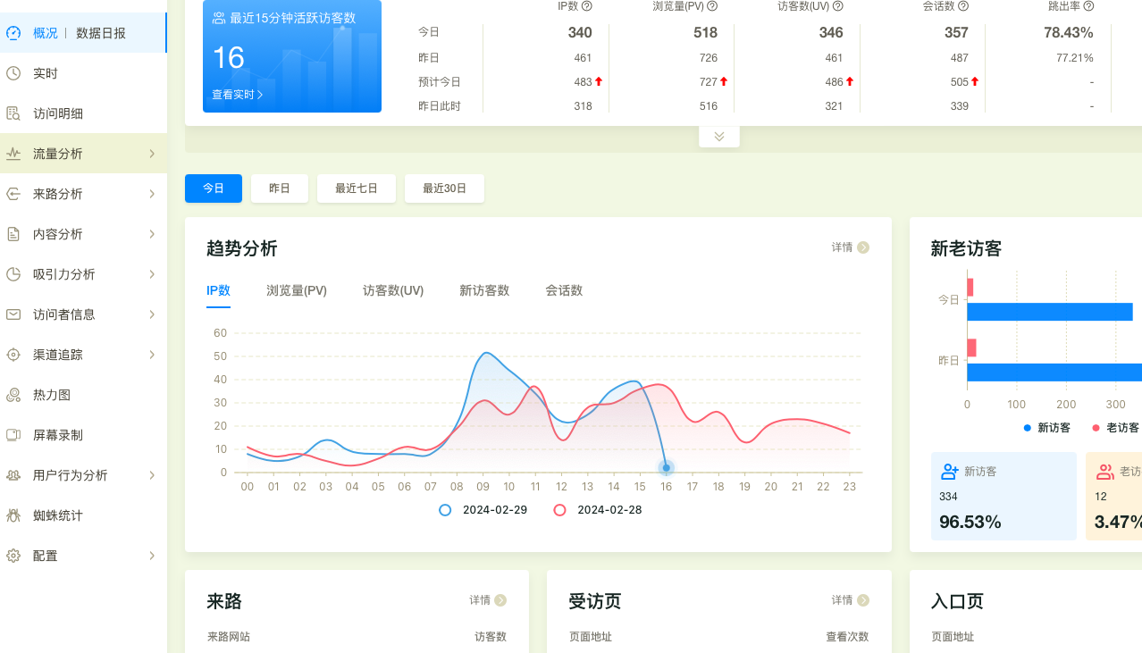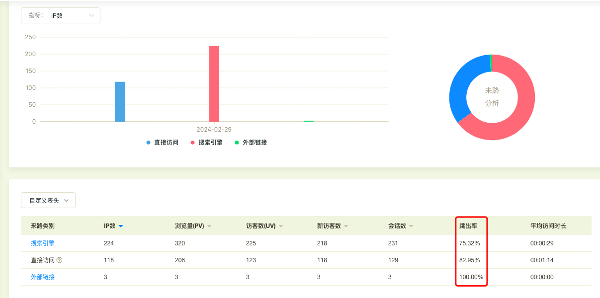 UV和PV在之前的文章中详细介绍过,跳出率是用户只访问一页就离开了的比例,访问页数则是用户平均访问的页面数量,停留时间是用户在网站上停留时间的长短,新访问比例是第一次来网站的用户数量。