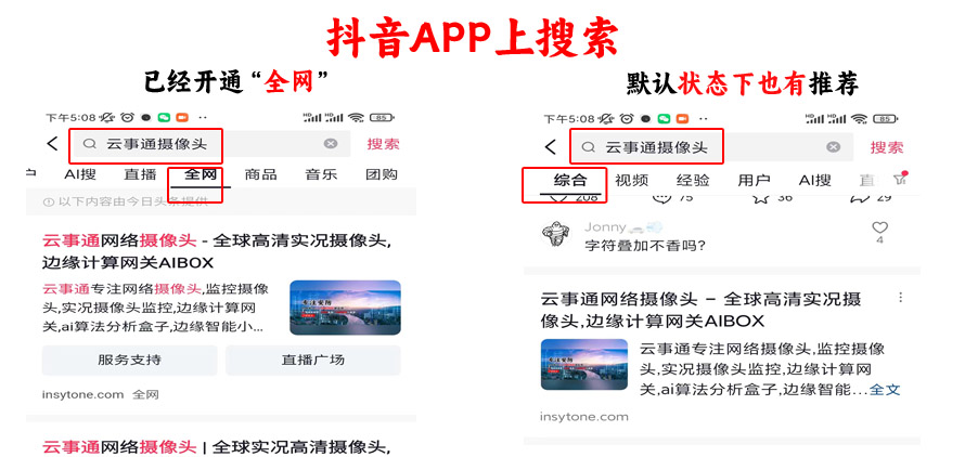惊到了,我用抖音APP搜索“云事通摄像头”发现,发现可以搜到“我们公司网站”排名,看来抖音把百度搜索研究透了,抖音APP开通了“全网”搜索功能,只要你的在头条有排名,就可以在抖音APP上搜到了你的网站了。
