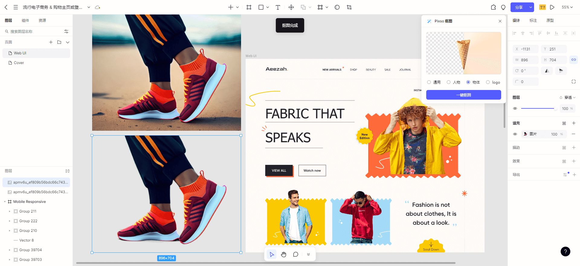 选择合适的网页设计模板,一键复制到Pixso编辑器里。将AI工具生成的图片导入到Pixso编辑器里,并使用Pixso抠图功能,将生成的图片进行背景移除,保留需要的设计元素。