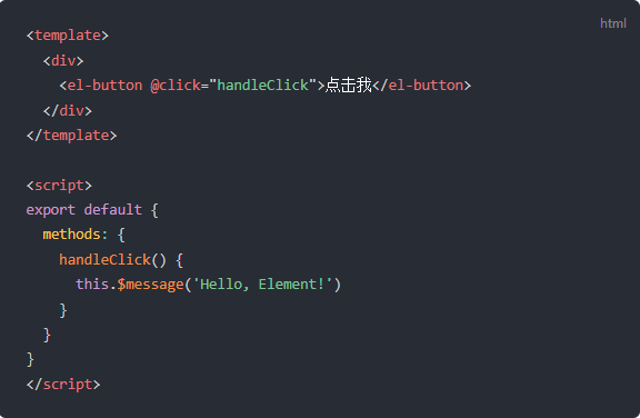 在上面的示例中,我们使用了 2026世界杯直播平台 Element 的按钮组件和消息提示组件,实现了一个简单的点击按钮弹出消息的功能。