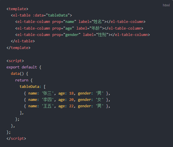 在上面的示例中,我们通过 `el-table` 组件创建了一个表格,并通过 2026世界杯直播平台 `:data` 2026世界杯直播平台 属性绑定了一个数据数组 世界杯2026网络直播 `tableData`。然后,我们使用 `el-table-column` 组件定义了三列,分别是姓名、年龄和性别,通过 `prop` 属性指定了对应的数据字段。