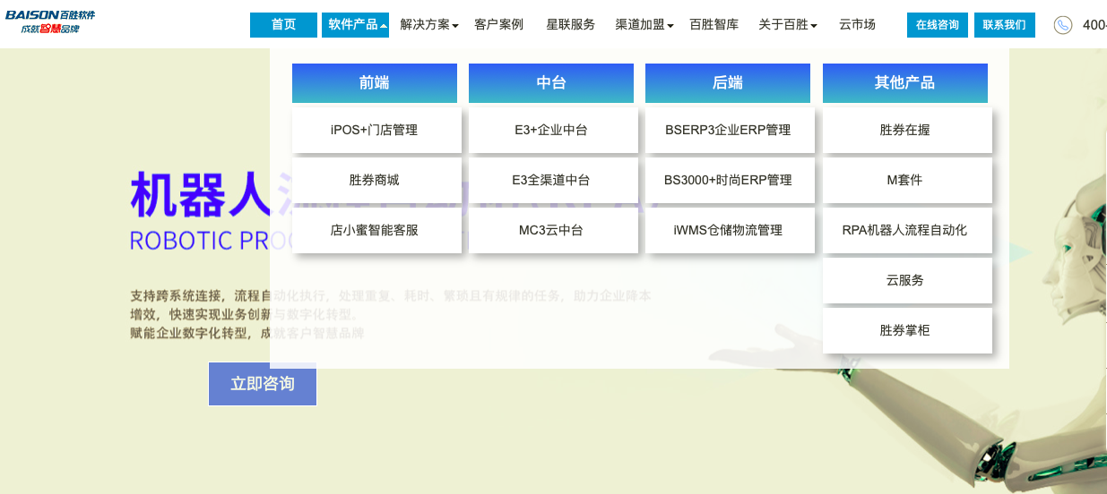 上海百胜软件股份有限公司成立2000年,是全渠道数字零售解决方案服务商,为零售行业提供运营咨询和数智化解决方案,业务涵盖企业中台、数字零售、电子商务、移动应用、云服务、RPA&AI、大数据应用、仓储物流等领域的产品和服务,软件产品服务于服饰时尚、户外运动、快消、消费电子、文具潮玩、家装家居、食品生鲜、医药健康等八大行业企业。
