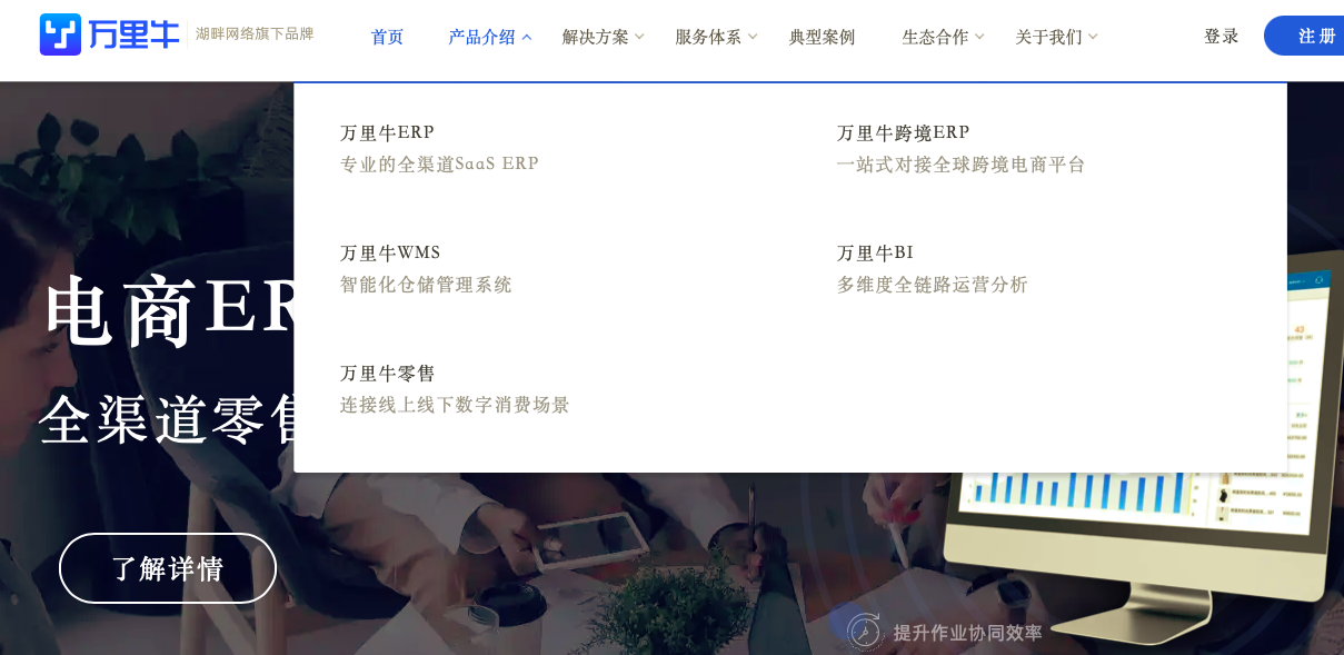 杭州湖畔网络技术有限公司旗下万里牛以ERP为核心,形成包括WMS、跨境ERP、BI、门店零售等在内的产品矩阵,服务于开展国内电商、跨境电商和实体门店等零售业务场景的企业。