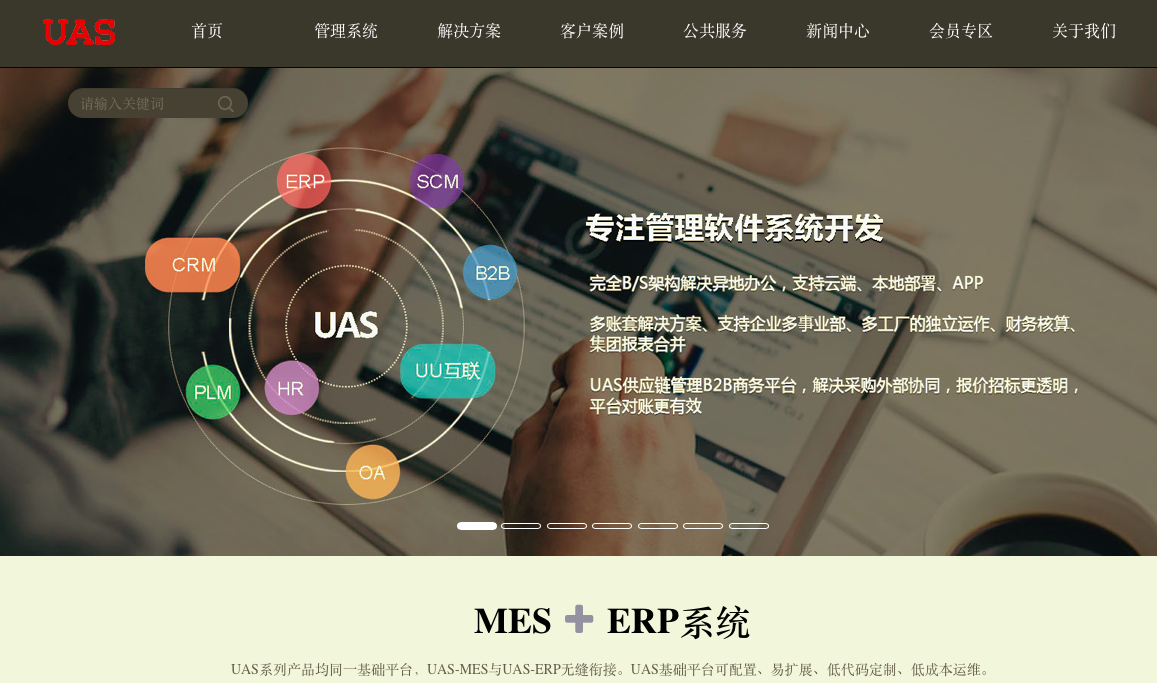 深圳市优软科技有限公司国内领先的企业管理软件服务商.主要致力于企业信息化管理系统的研发、咨询与应用,以打造ERP+和MES+为基础应用,以自动化、可视化、智能化助力经营管理和生产现场的高效运作的企业信息协作UAS平台(UAS是联合应用系统“United 2026世界杯直播平台 Application 2026世界杯直播平台 System”的英文简称)。UAS应用囊括了UAS-ERP企业管理系统、UAS-MES制造执行系统、UAS-WMS智能仓储系统。
