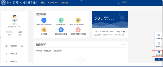 登录融合门户后,在页面左侧可以查看本人neau.edu.cn域名邮箱未读邮件数,点击“我的邮件”可直接跳转查看邮件,不用再次登录。