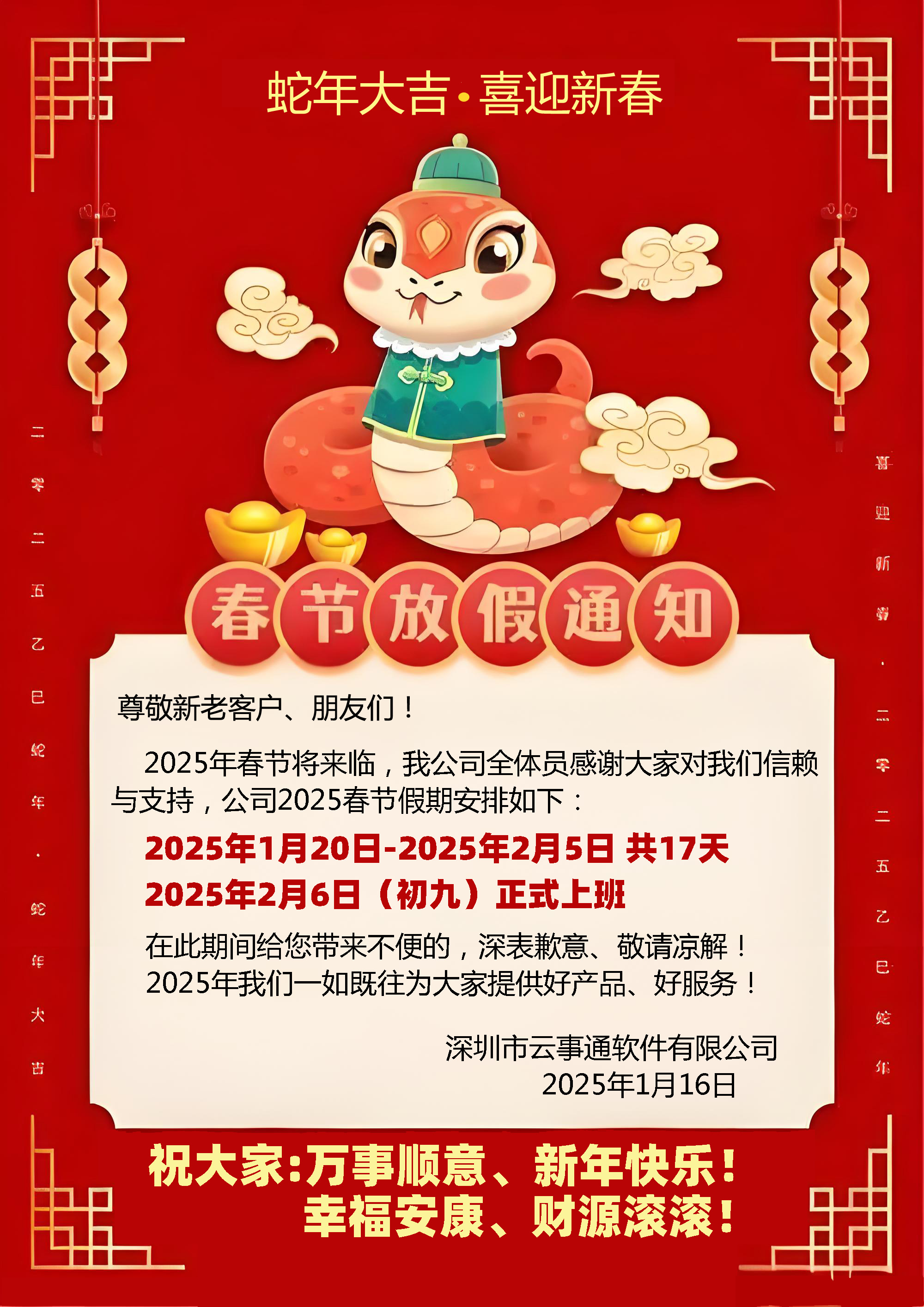 2025年云事通软件春节放假通知2025年春节即将来临,我公司全体员感谢大家对我们信赖与支持,公司2025春节假期安排如下:分类:公司新闻关键词:春节放假通知放假通知2025年春节即将来临,我公司全体员感谢大家对我们信赖与支持,公司2025春节假期安排如下:
